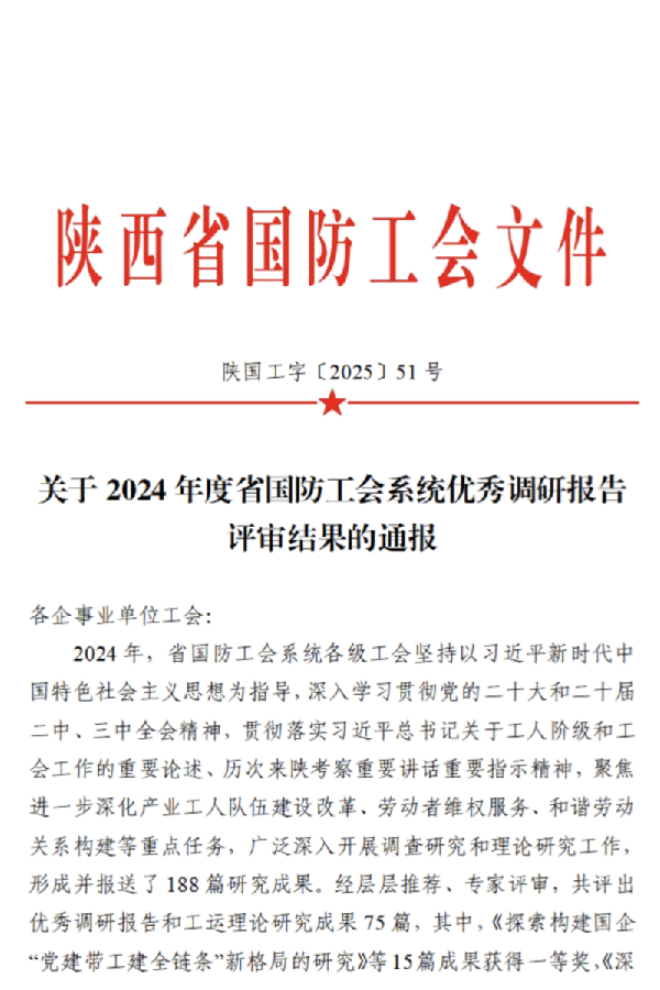 公司职工调研报告荣获省国防工会系统优秀调研成果一等奖