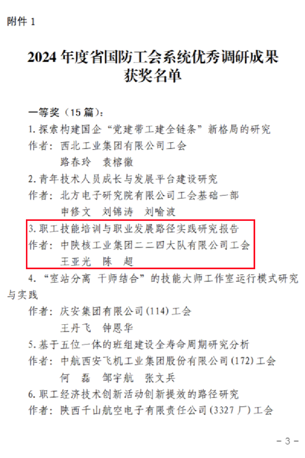 发表时间:近日,在2024年度省国防工会系统优秀调研成果评选活动中,由王亚光、陈超撰写的《职工技能培训与职业发展路径实践研究报告》荣获一等奖,郑银龙、刘建文撰写的《“职工书屋”建设和作用发挥情况研究报告》荣获三等奖。