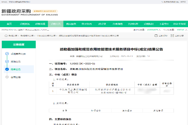 10月13日,新疆政府采购网传来喜讯——中陕核工业集团测绘院有限公司凭借雄厚技术实力、丰富项目经验与卓越市场信誉,在众多竞争者中脱颖而出,成功中标“疏勒县加强和规范农用地管理技术服务”项目。这是继阿克苏地区、喀什地区、阿勒泰地区之后,测绘院在新疆市场斩获的又一重要项目,标志着测绘院在新疆区域市场拓展取得实质性突破,也是对测绘院在自然资源调查监测领域专业能力的高度认可。