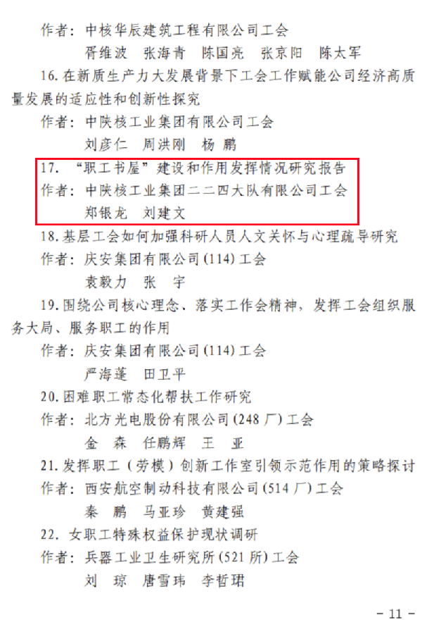 发表时间:近日,在2024年度省国防工会系统优秀调研成果评选活动中,由王亚光、陈超撰写的《职工技能培训与职业发展路径实践研究报告》荣获一等奖,郑银龙、刘建文撰写的《“职工书屋”建设和作用发挥情况研究报告》荣获三等奖。