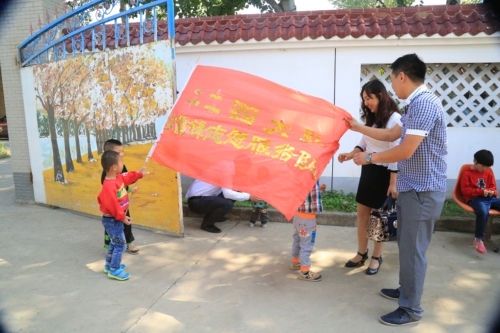 广场上,几位学龄前小朋友三五成群在一起玩耍,大家情不自禁地和孩子们围在一起,抱着他们说起了“悄悄话”。谈笑间,小朋友悄悄地撑起了“二二四大队学雷锋志愿服务队”这面旗帜,画面温馨。