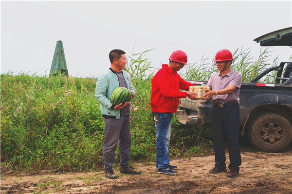 最后,陈总向野外一线职工发放了西瓜、饮料等解暑降温慰问品,在送去清凉和关怀的同时为野外一线职工鼓劲加油,叮嘱他们要养成良好生活习惯,确保工作顺利开展。