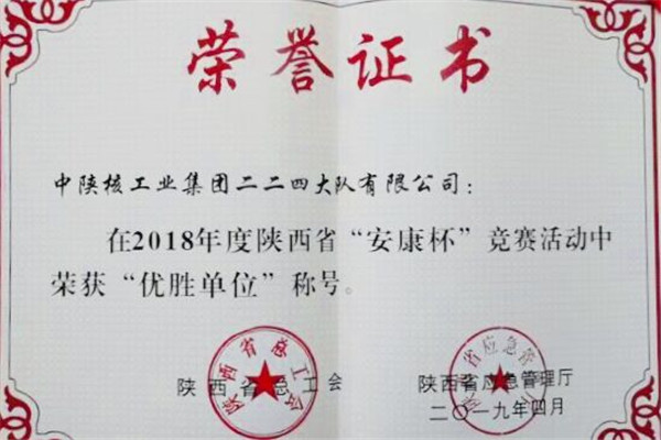 近日,二二四大队在2018年度陕西省“安康杯”竞赛活动中,荣获陕西省“安康杯”竞赛“优胜单位”荣誉。