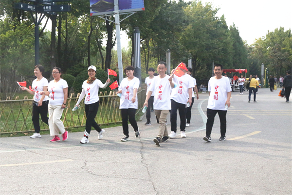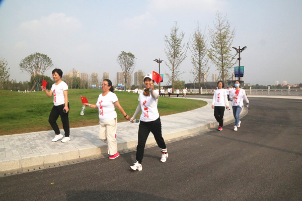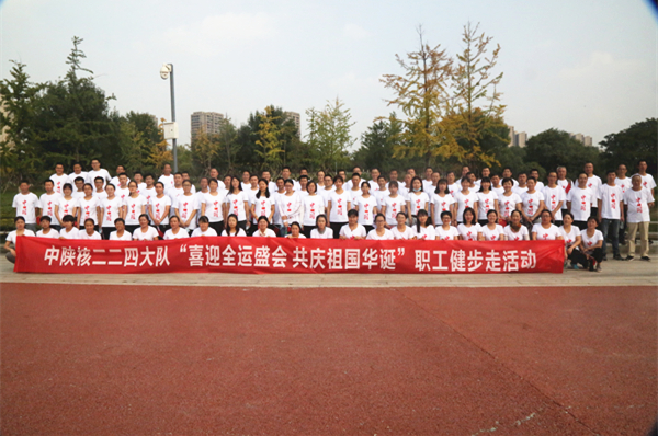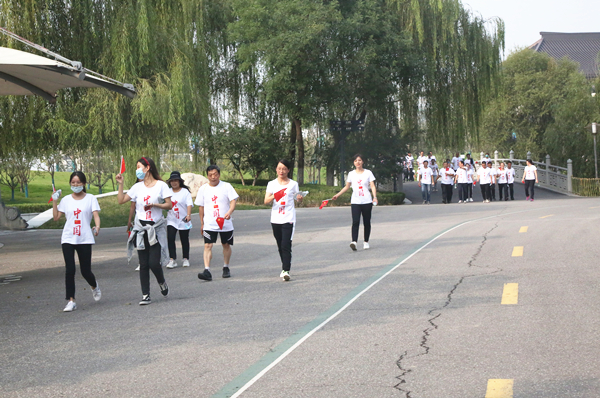 在鲜红国旗的映衬下,公司100余名参赛职工组成“我❤祖国”花式队形,脸上都洋溢着对五星红旗的无比自豪和对祖国母亲的深切祝福。大家以矫健的步伐,以昂扬的士气,走在西安世博园健步道上,一路向前,追赶超越,展现了二二四人的良好精神状态,彰显了二二四人的满腔爱国精神。