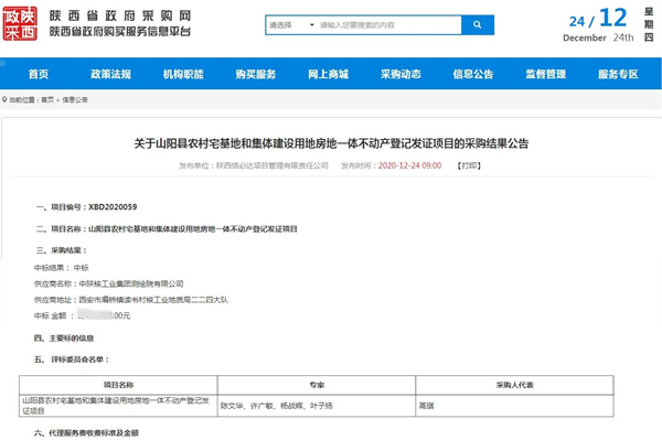 12月24日,从陕西省政府采购网获悉,测绘院成功中标山阳县农村宅基地和集体建设用地房地一体不动产登记发证项目。