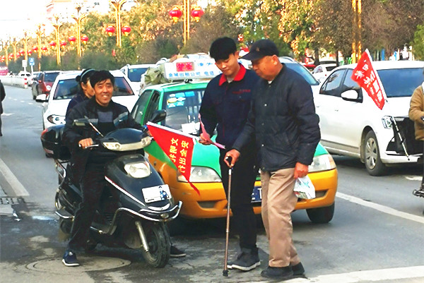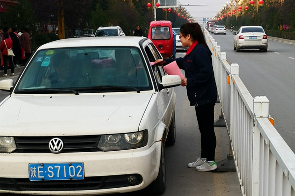 相伴在初冬温暖的阳光下,志愿者们到达潼关县和平路与北环路十字路口,在北环路什字岗位值班交警蒋建刚同志的认真指导下,志愿者向斑马线前红灯等候的机动车司机发放“车让人”倡议书及宣传折页,向非机动车驾驶员讲解文明交通“车让人”标准,同时,还提醒行人文明出行,文明礼让。