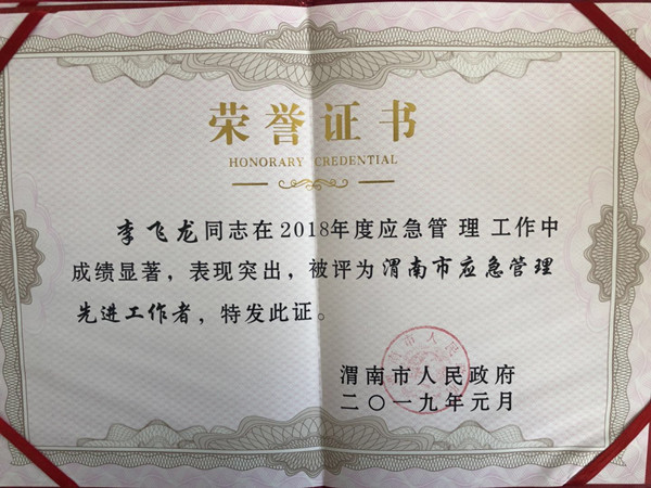 1月7日,渭南市人民政府正式授予中陕核钼业有限公司“2018年度渭南市应急管理先进单位”,同时,生产技术部部长车伟峰荣获“渭南市应急管理优秀值守员”荣誉称号,安全环保部部长李飞龙荣获“渭南市应急管理先进工作者”荣誉称号。
