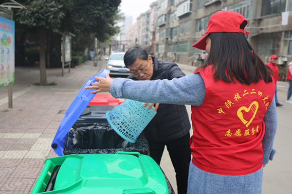 志愿者向小区居民详细介绍了垃圾分类的标志、品种及相关知识,发放了彩页宣传册,捡拾路面及绿化带垃圾,在分类垃圾投放处正确引导居民如何进行分类投放,传播了文明新时尚。