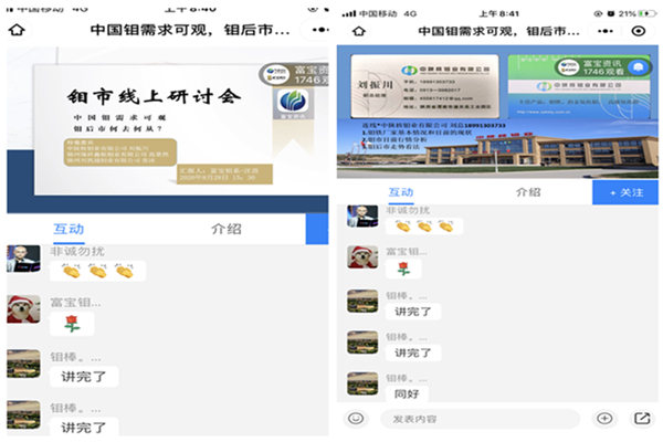 通过本次线上交流会议,钼业公司进一步推广了企业品牌,提高了企业知名度,同时与各企业进行了信息共享,进一步深化了合作交流,更好地维护了钼市场平稳健康发展,为圆满完成公司经营目标任务打下了坚实基础。