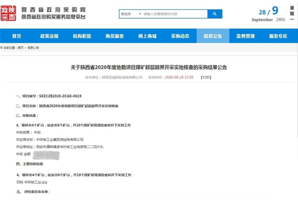 9月25日,喜讯传来!测绘院中标陕西省2020年度地勘项目煤矿超层越界开采实地核查项目。