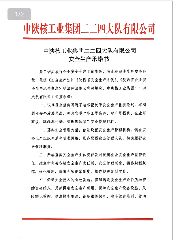 中陕核工业集团二二四大队有限公司安全生产承诺书
